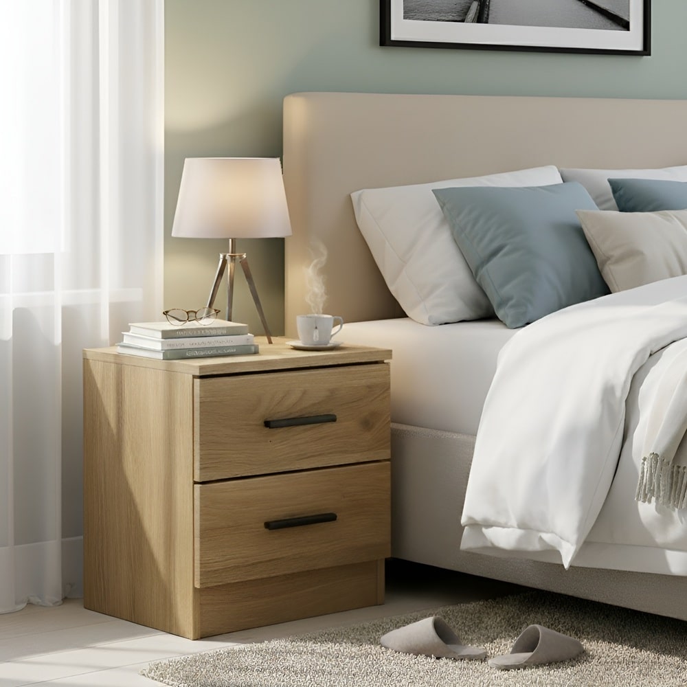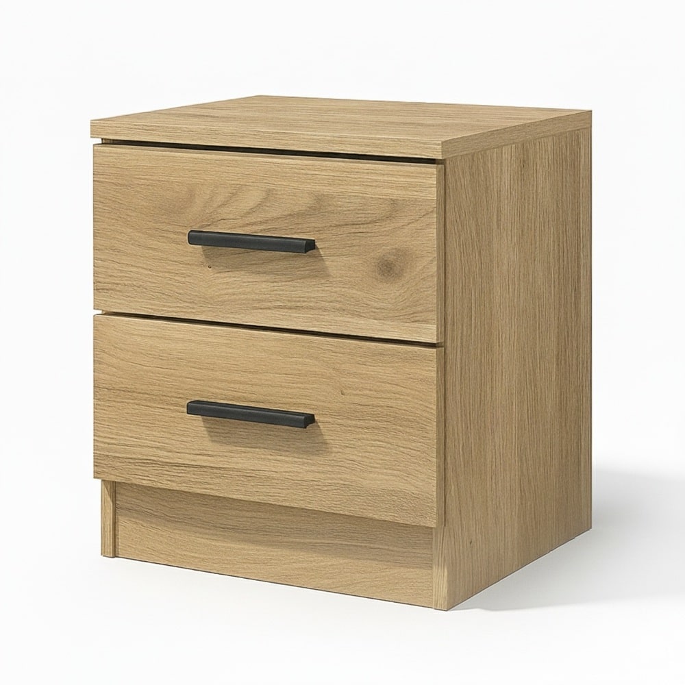 The two-drawer Metz bedside table is a practical, modern piece for your home.