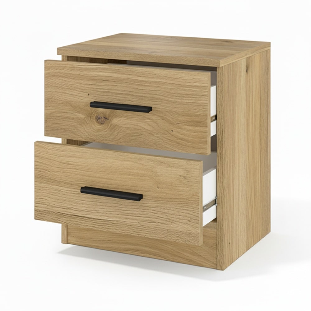 It is made of melamine and particle board. These materials provide a stable structure that is easy to clean and resistant to daily use. The oak-grain colour gives the space a natural, warm look. The black handles add a modern look and make the drawers easy to open.