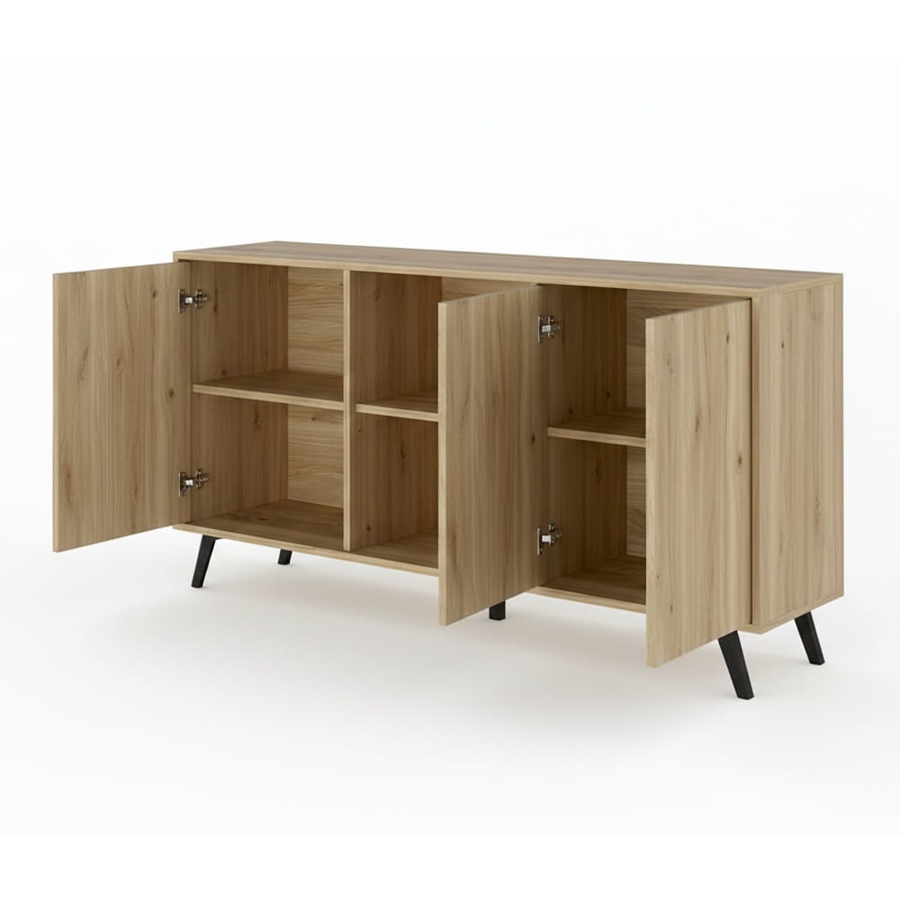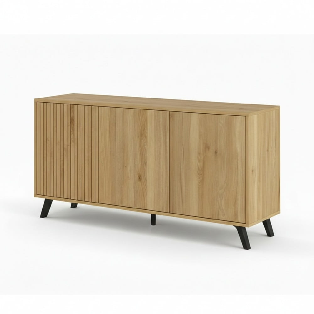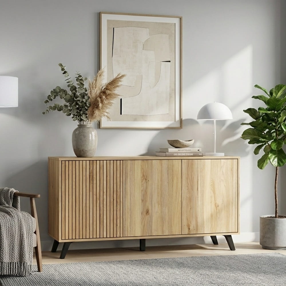 Este aparador destaca por su frontal de 3 puertas, donde la puerta izquierda presenta un exclusivo diseño de rayas verticales en relieve, creando un juego visual de texturas que rompe la monotonía. Las otras dos puertas mantienen un acabado liso en roble, resaltando las vetas naturales de la madera.