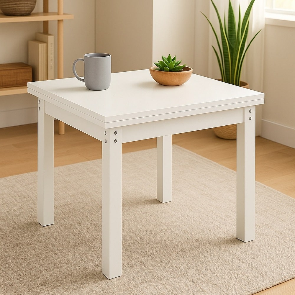 Puedes optar por alguno de los diseños de color blanco o roble para que combine en la habitación. Por otra parte, la tapa superior sobresale de la base inferior. En caso de que uses esta mesa sin extender, podrás disfrutar de una superficie cuadrada. Asimismo, ocupa menos espacio visual.