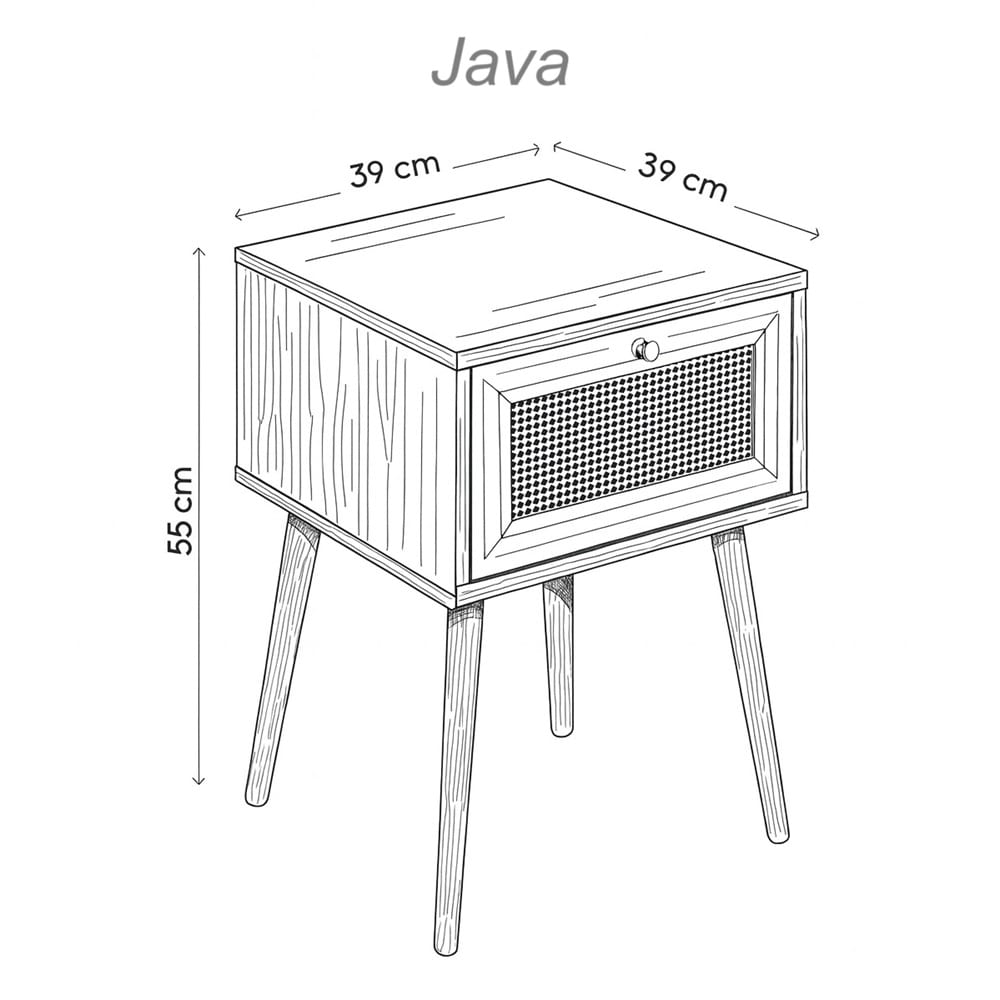 Diseñada exclusivamente para interiores, la mesita de noche Java es perfecta para dormitorios de estilo boho, vintage o incluso nórdico, gracias a su combinación de materiales naturales y líneas simples.