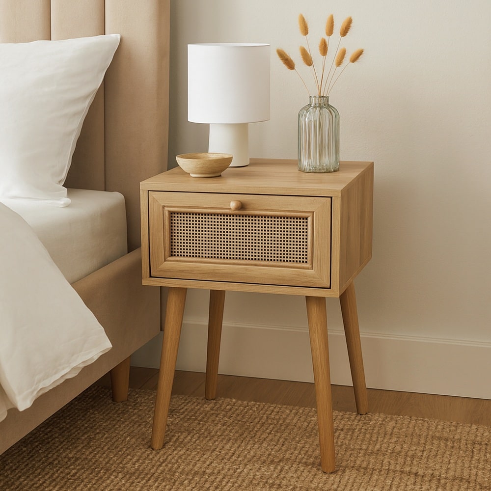 El detalle más característico es su cajón frontal con rejilla, un elemento que realza el estilo boho y aporta un toque artesanal y ligero al diseño. El cajón es práctico para guardar objetos pequeños como libros, cargadores o accesorios personales, manteniendo el espacio ordenado y despejado.